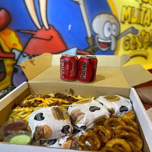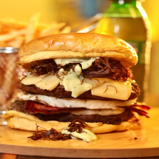 Pão brioche selado na manteiga da terra, 2 burguer fraldinha 120 gramas, duplo muçarela, carne do sol, ovo frito, e du... Ver completo