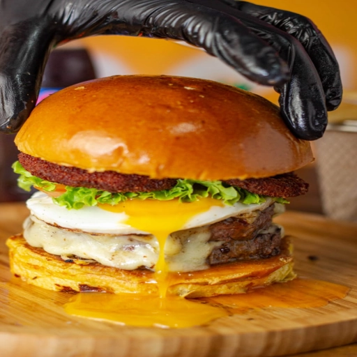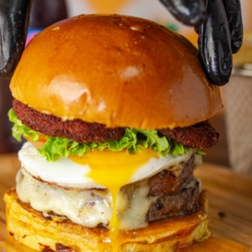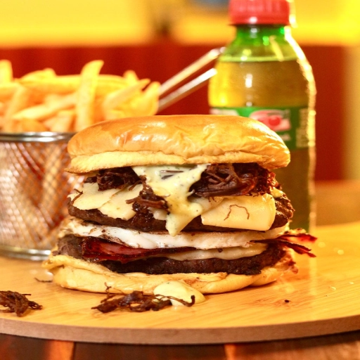 Pão brioche selado na manteiga da terra, 2 burguers 120 gramas duplo queijo prato, creme cheadar, 2 ovos fritos, carne ... Ver completo