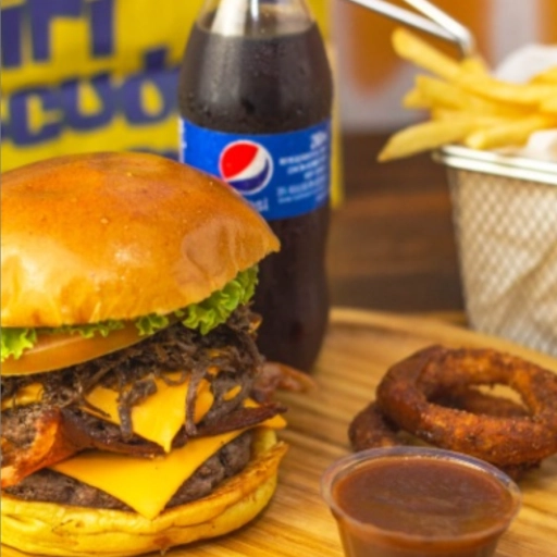 Pão brioche selado na manteiga da terra, 2 burguers 120 gramas de fraldinha, duplo muçarela, ovo frito , 2 onion rings... Ver completo