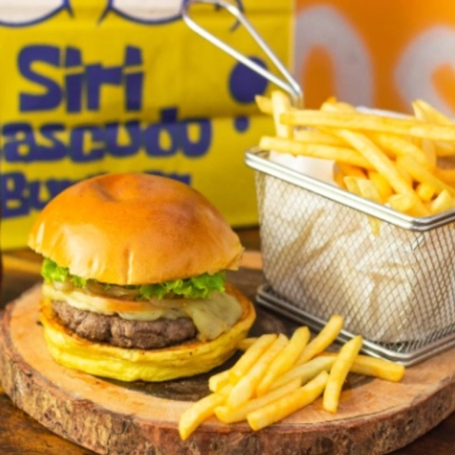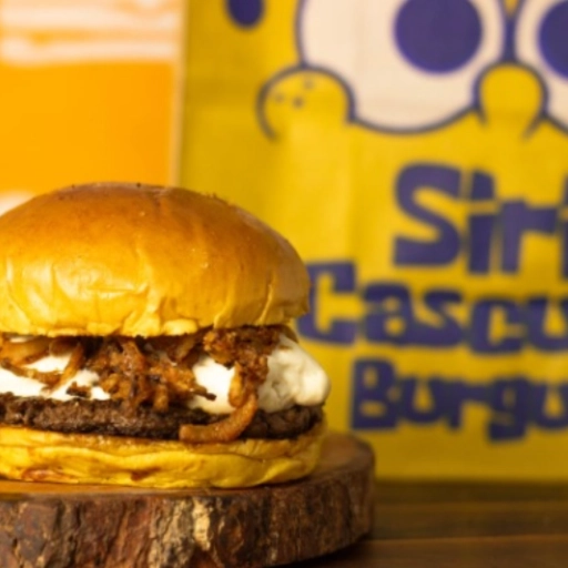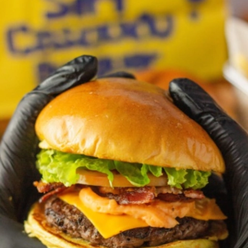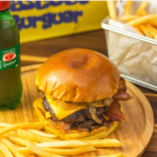 Pão brioche selado na manteiga da terra, 2 burguers suculento, duplo queijo cheadar, bacon crocante carne do sol 2 onio... Ver completo