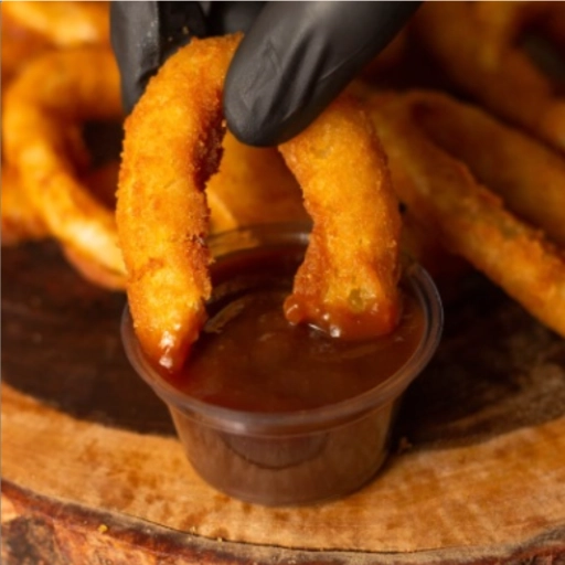 Cebola empanada 13 unidades acompanham molho barbecue.