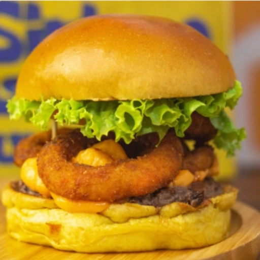 Pão brioche selado na manteiga da terra, burguer 120 Gramas suculento. Creme cheadar, 4 unidades de onion rings alface ... Ver completo