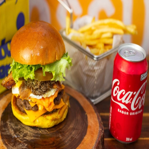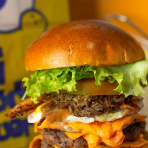 Pão brioche selado na manteiga da terra, 2 burguers 120 gramas duplo queijo prato, creme cheadar, 2 ovos fritos, carne ... Ver completo