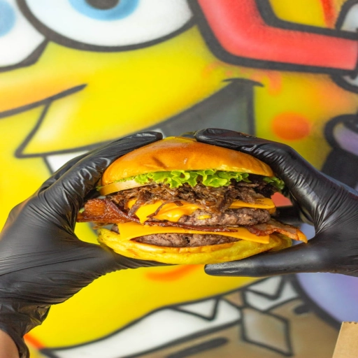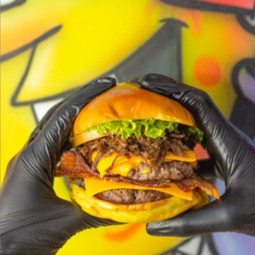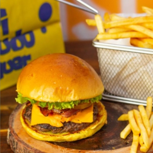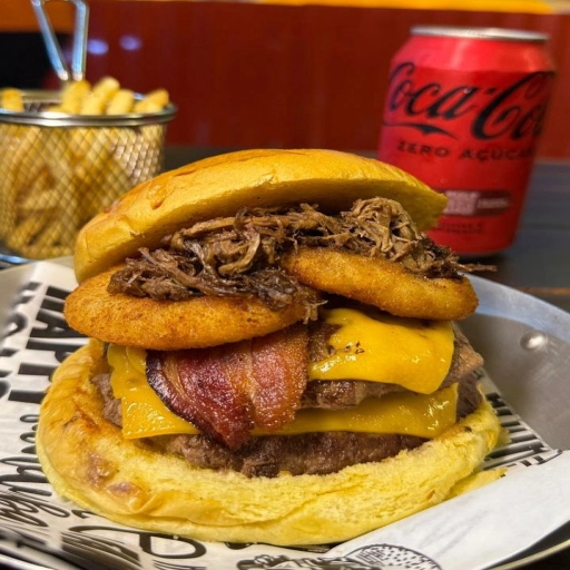 Pão brioche selado na manteiga da terra, 2 burguers suculento, duplo queijo cheadar, bacon crocante carne do sol 2 onio... Ver completo