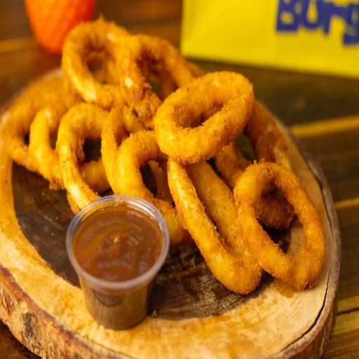 Cebola empanada 13 unidades acompanham molho barbecue.