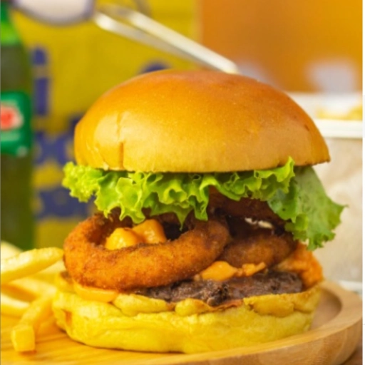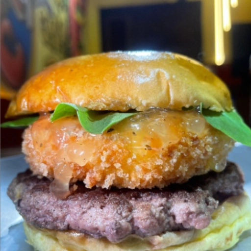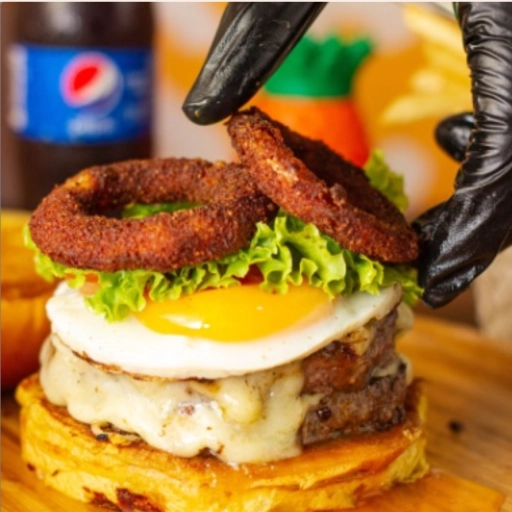 Pão brioche selado na manteiga da terra, 2 burguers 120 gramas de fraldinha, duplo muçarela, ovo frito , 2 onion rings... Ver completo
