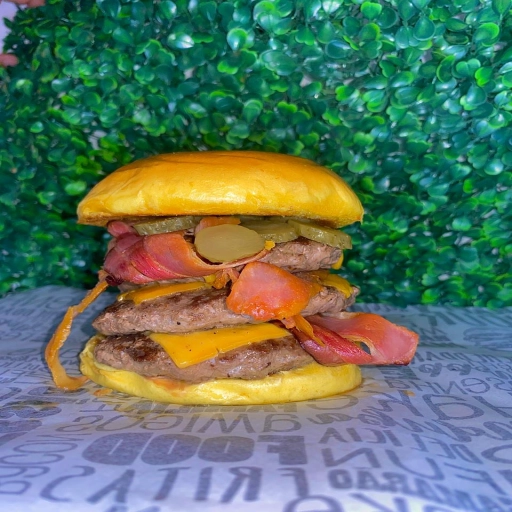 Pão de brioche selado na manteiga da terra , 3x burguer bovino de 120 gramas cada , 3 fatias de queijo chedda vigor TR... Ver completo