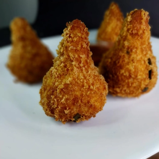 Sao 4 unidades de coxinha sem massa.Feito com 100% de peito de frango e creme chesse frango bem temperado, acompanha mol... Ver completo