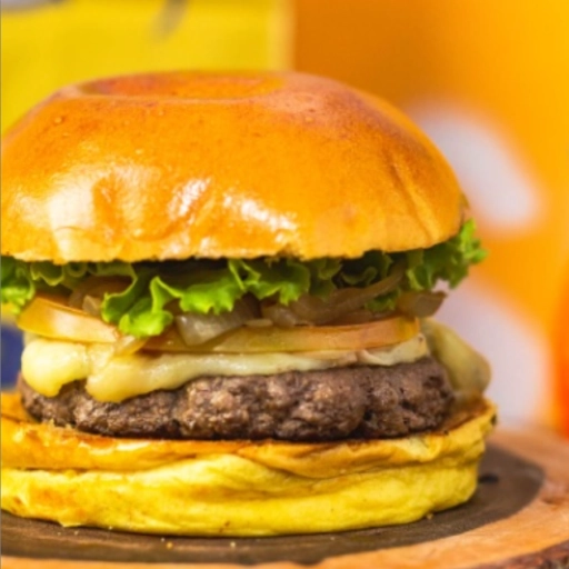 Pão brioche, hambúrguer 120g, cheddar, creme cheddar, bacon, alface e tomate.