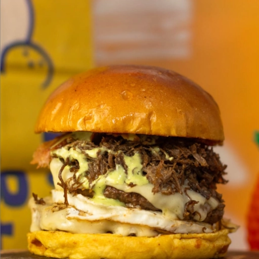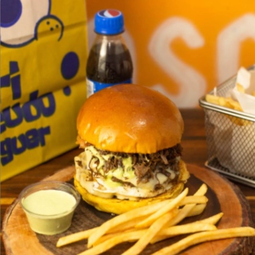 Pão brioche selado na manteiga da terra, 2 burguer fraldinha 120 gramas, duplo muçarela, carne do sol, ovo frito, e du... Ver completo