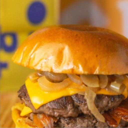 Pão brioche selado na manteiga da terra, 2 burguer 120 gramas, duplo queijo cheadar , bacon crocante e cebola carameliz... Ver completo